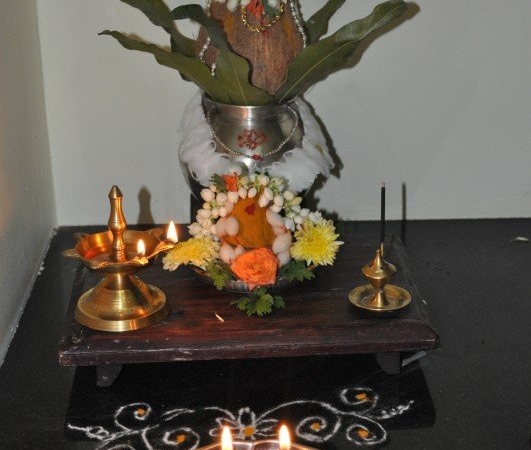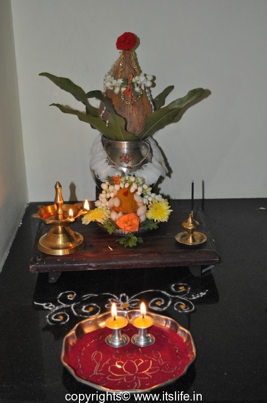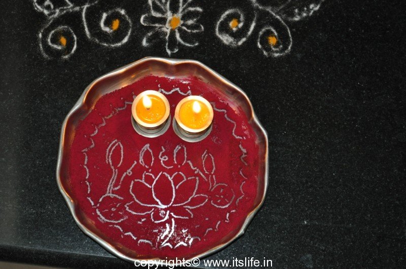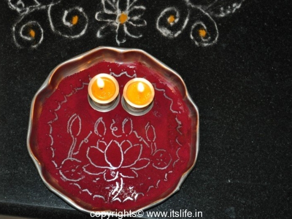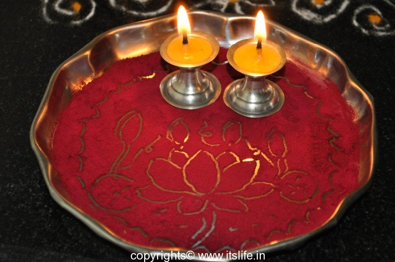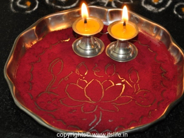 Light the lamps and keep them over the Arathi Thatte – Plate Decoration with Vermilion and enjoy the Aarathi.