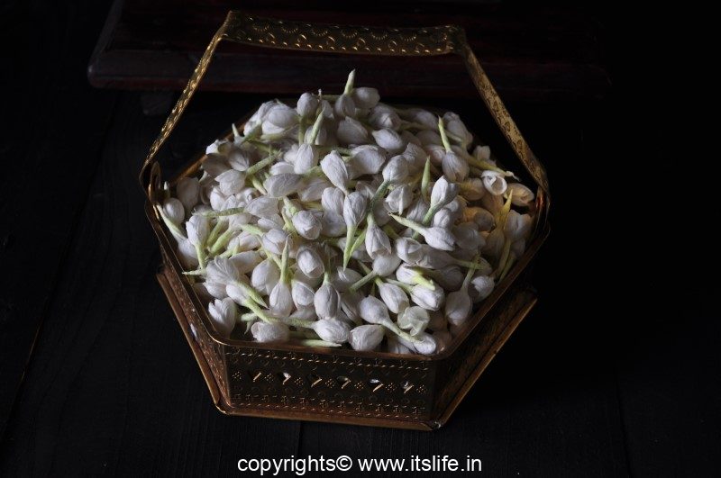 Jasmine Buds made using Cotton looks real and when a basket is filled with them, it makes a beautiful center piece during festivals.