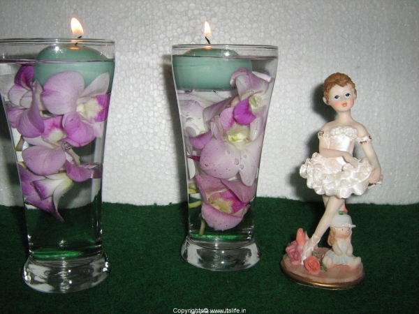 Tall juice glasses, filled with exotic flowers and water make beautiful containers to float candles and can be used as decorative pieces to adorn mantle pieces at home on occassions and festivals.