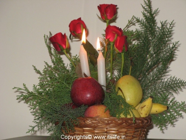 Line the bottom of the basket with a plastic sheet. Place the sponge in the middle. Arrange the fruits first on the sides of the sponge. Cut the Roses in different lengths. Stick the Roses in any pattern you desire into the sponge. Cut the Cyprus stalks into long and short stems. Stick these on the other later and camouflage the sponge. Stick Candles into the sponge and light it up.