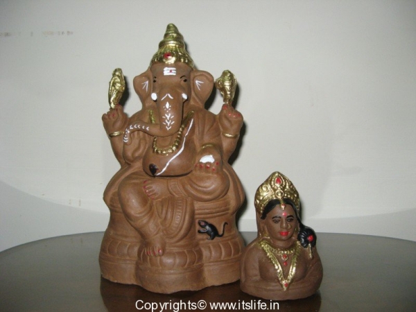 When the idols of Ganesha Gowri are immersed in the various natural water bodies, the chemical paints used to paint the Ganesha Gowri Idols are causing a lot of pollution and killing many water lives. So, this year we opted for the eco friendly Ganesha-Gowri idol and painted them using Water and Fabric colors.