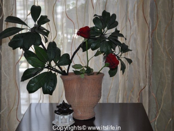 Friends forever flower arrangement is composed of branches from the Umbrella Tree and two roses.  The terracotta container has two openings.