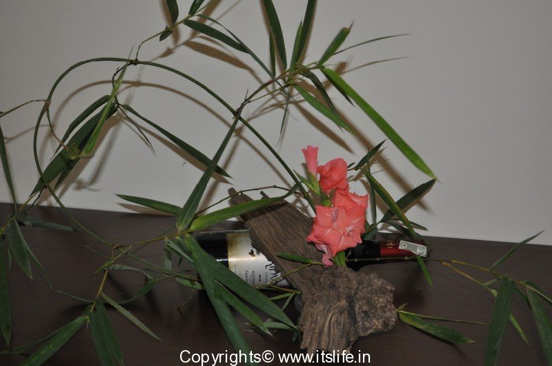 Lie the Wine bottle down. Keep the driftwood over the Wine bottle. Keep the wet sponge below the driftwood. Fix one end of the Bamboo into the sponge and bring the other end over the driftwood and fix it in the sponge from below the driftwood. Fix the Gladioli stalk into the sponge.