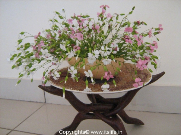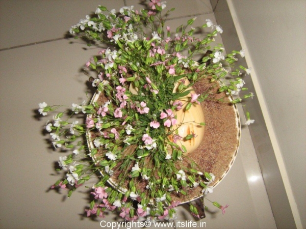 Fill the Ceramic tray with sand and place it on a stool or a stand. Place the Shell in the center of the tray. Cut the stems of the flower bunches in such a way that only one inch of the stem is tucked inside the shell groove. Arrange all the bunches and pour water inside the shell.