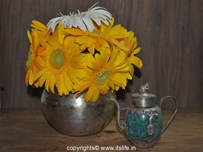 Let us bring in some sun into the house during the cold winters. Yellow and white Gerberas together are a joy to look at and here is just the arrangement for gloomy winter days!