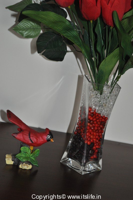 Arrange the flowers in the Vase and fill the Vase with layers of Gulganji, Tamarind Seeds and Plastic Crystals. A perfect arrangement for Valentine’s day.