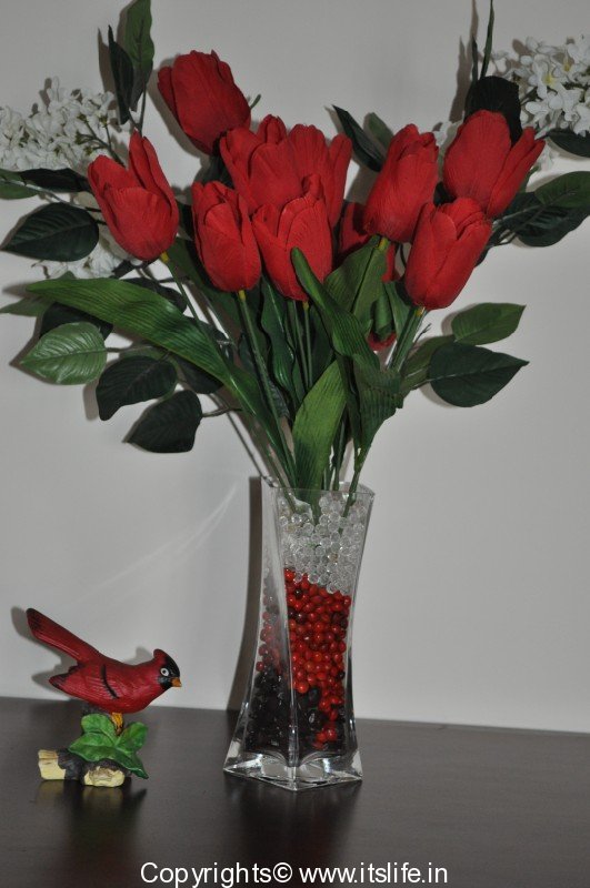 Arrange the flowers in the Vase and fill the Vase with layers of Gulganji, Tamarind Seeds and Plastic Crystals. A perfect arrangement for Valentine’s day.