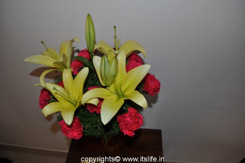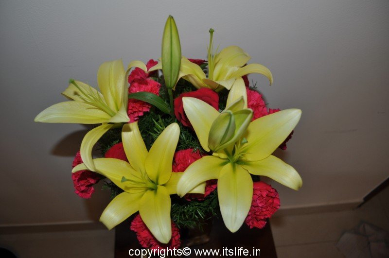 Flower arrangement – Yellow Lily with Carnation bouquet
