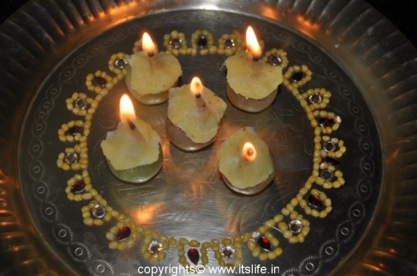 Kundan Arathi Plate is a plate decorated using Kundans and other materials like Bengal Gram, Split Green Gram, Bindis, plastic leaves, and so on.  These decorated plates are used to perform Arathi to gods and goddesses during festivals.
