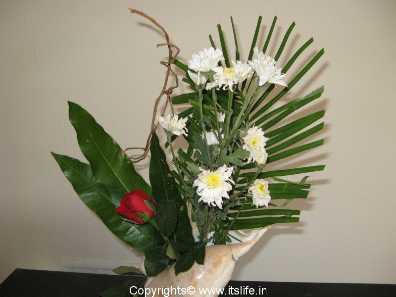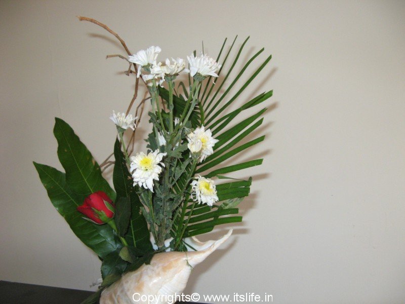 Trim the edges of the Palm leaf. Bend the edge of the palm and tie it to the middle of it’s stem to give a fan shape. Arrange the flowers, twigs and leaves as shown in the pictures and place it on either a black wooden plank or a stool.