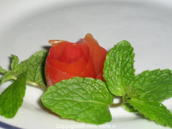 Cut a tomato into a beautiful Tomato Rose Flower and use it for decorating your dish or the dining table.