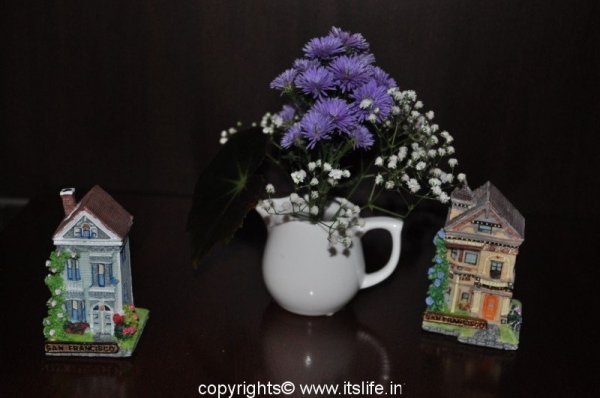 Keep the pin in the center of the jug. Arrange the leaf and flowers as shown in the picture below.