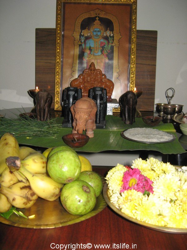 The elephants are kept in the house for 3 days and worshipped. On the last day the elephants are worshiped and offered thair sadam / mosaranna / curd rice as naivedya. During Visarjana (send off) little curd rice is sent along with them by wrapping it in a leaf. The elephants are then immersed in a river or and they are left under a Banana plant or under a Bamboo grove.