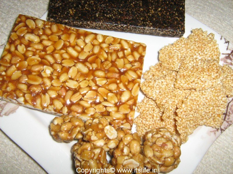 The Gujaratis celebrate Makara Sankranti as Uttarayan for two days by flying kites and preparing dishes like Tal Sankadi/Sesame Seeds bar, Jalebi, Undhiya and Groundnut Chikki/Peanuts bar.