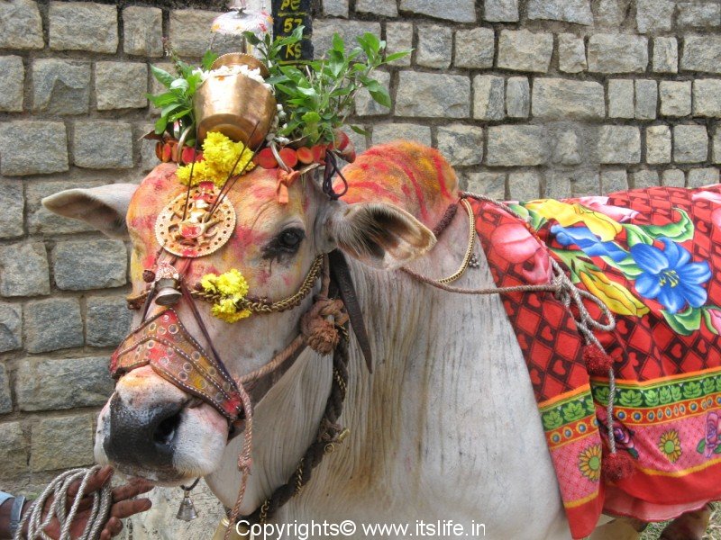 On the same evening children aged 5 and below in the house are dressed up in ornaments made of Kusuri Kalu and are made to sit on a mat and a mixture of Puffed Rice, Berries, Chocolates, Silver/Gold items, Sugar Candy, Coins are mixed and poured over their head to their delight. This ritual is known as “Kari Yeriyodu” and an aarathi is performed. The neighbors are invited to participate in this ritual. This ritual is performed to drive away the evil eye. In the evening the farmers decorate their cows and bullocks and worship them. They take them out on a procession and make them jump over fire.