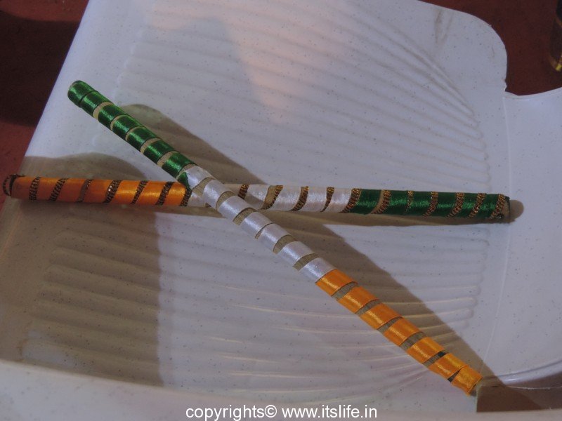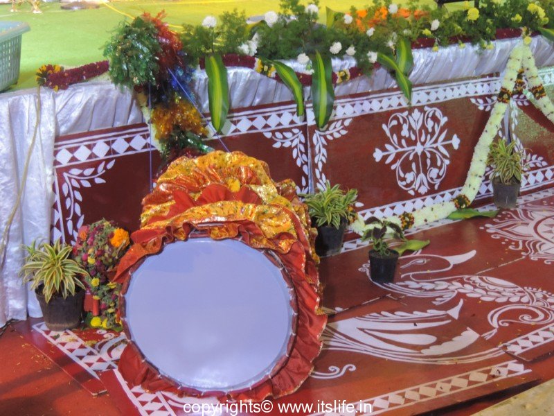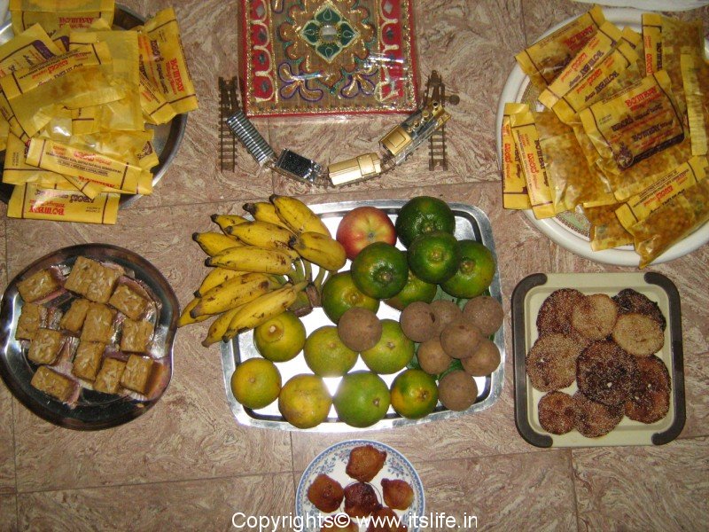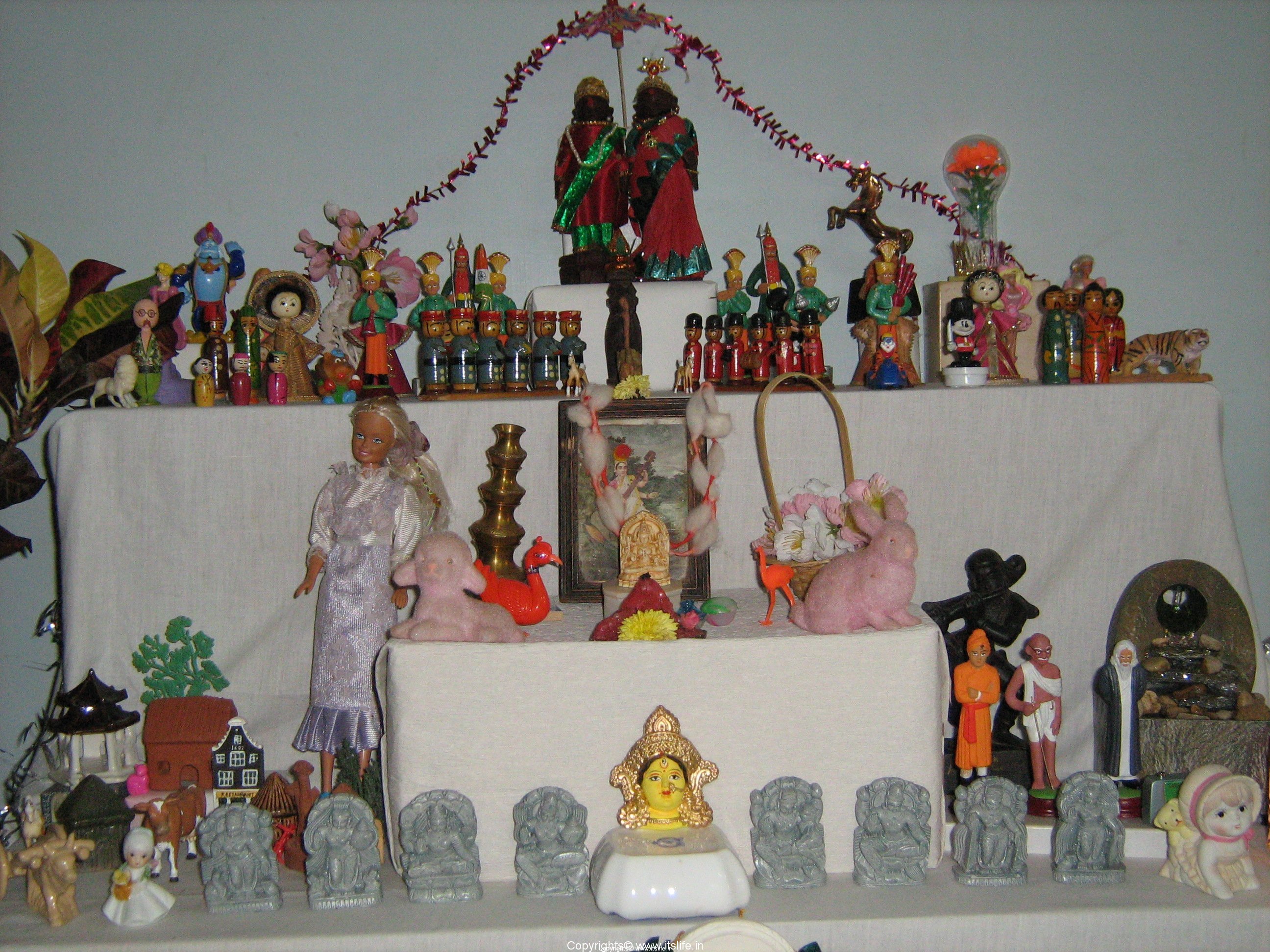 To represent the maharajahs/kings rose wood dolls of the king and queen are kept on top with a kalash (a small vessel made of silver or copper filled with water and betel leaves arranged over it). In the evenings special aarthi is performed to the gombe and children’s favorite sweets and savories are prepared like Khobbari Mithai/Coconut Burfi, Nippattu, Kodabale, Chakkali, Khara Sev, Besan Laddoo, Rava Laddoo etc., and distributed among the neighborhood kids. It is known as gombe bagana.