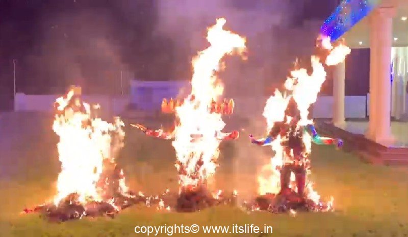 In the evening 2 Men dressed as Rama and Lakshmana shoot fire arrows at the effigy and it goes up in flames busting crackers.
