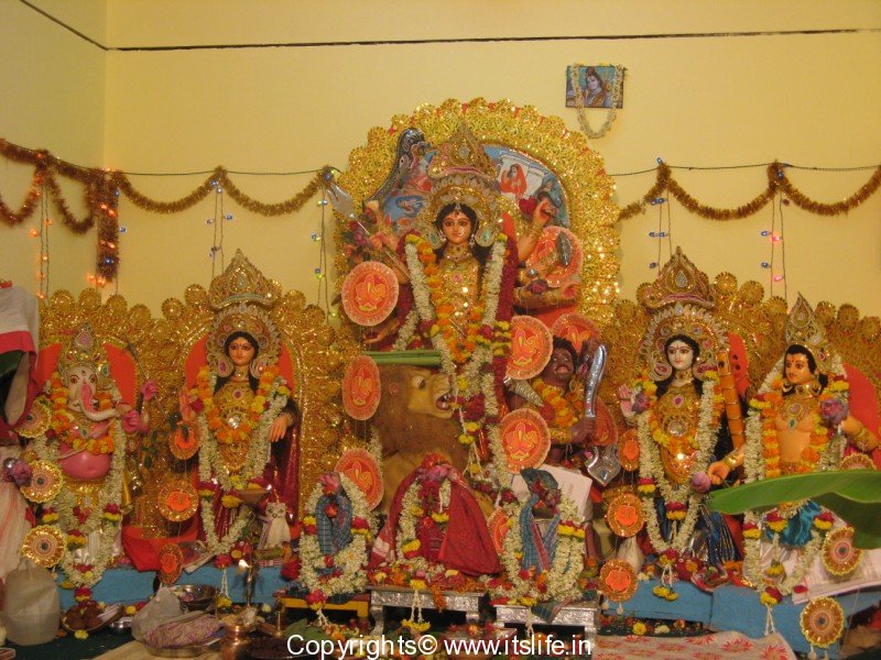 In East India especially in Bengal, Durga Puja, which starts on the fifth day is the biggest festival. It is the festival to commemorate the triumph of Good over Evil. Community celebrations are very common and huge idols of Durga slaying Mahishasura are installed in colorful pendals (marquee). In the evenings people around that place come together to enjoy musical and cultural evenings. The last day of the festival is known as Dasara or Vijayadashami.