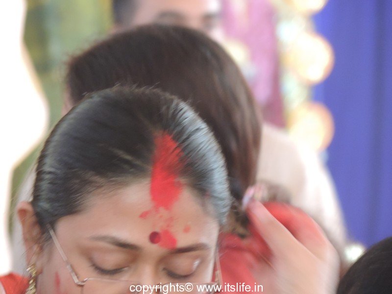 On Vijayadashami day as a send off to the goddess people celebrate with music and revelry. Married women with a plate filled with betel leaves, sweets, flowers, sindoor (kumkum) first offer these to the goddess and then apply Kumkum/vermilion colored powdered on each other known as Sindoor Khela before the Durga idol is taken in a procession for visarjan/immersion in rivers or ponds.