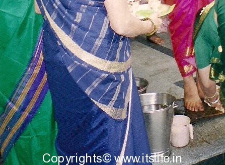 Perform an aarathi to all the women and girls and do Namaskara / obeisance. Give manthrakshathe (rice smeared with kumkum) to all the women and children. All of you can go to the temporary coconut palm pendal put up outside the house and sprinkle the Manthrakshathe on the pendal and get inside the house.