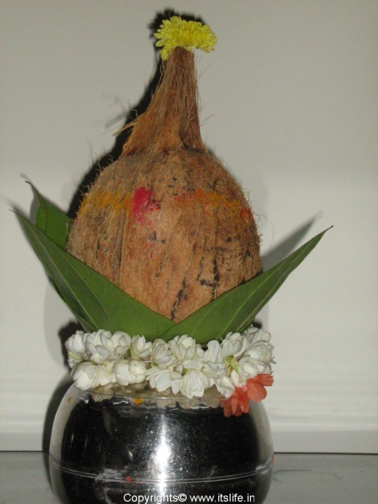 Using Sunna/Lime stone draw a line in the middle of the pot and decorate with flowers and Turmeric and Kumkum powder. Arrange the leaves on the pot by immersing ¼ of the leaves from the stalk in the water. Clean the Coconut and remove the extra husk, do not remove the pointed edge of the coconut. Wash it with water and apply Turmeric powder and Kumkum on the Coconut. Place it on the pot with the pointed edge towards the sky. Keep a flower or a string of flowers over it. This is usually kept in front of the gods photographs or idol.