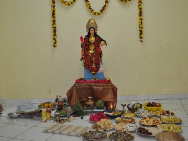 The Pooja is performed by married women in the evening and a night vigil is observed. The women fast during the day and break the fast at midnight after offering food to Goddess Lakshmi.