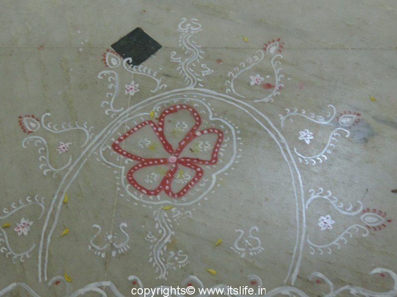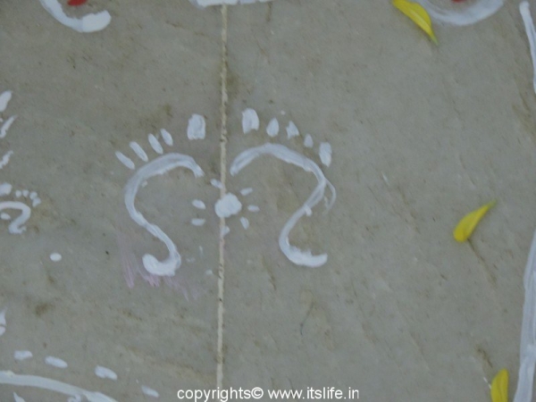 Small feet of the goddess leading from the main door into house is drawn using Alpana.