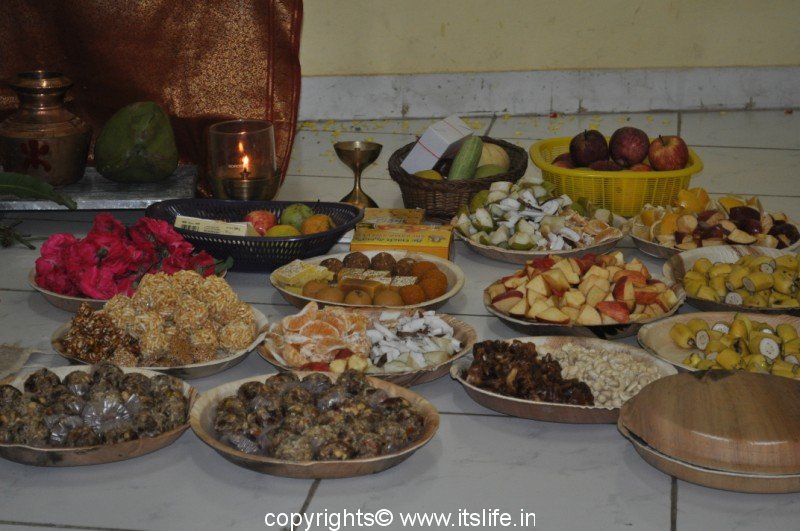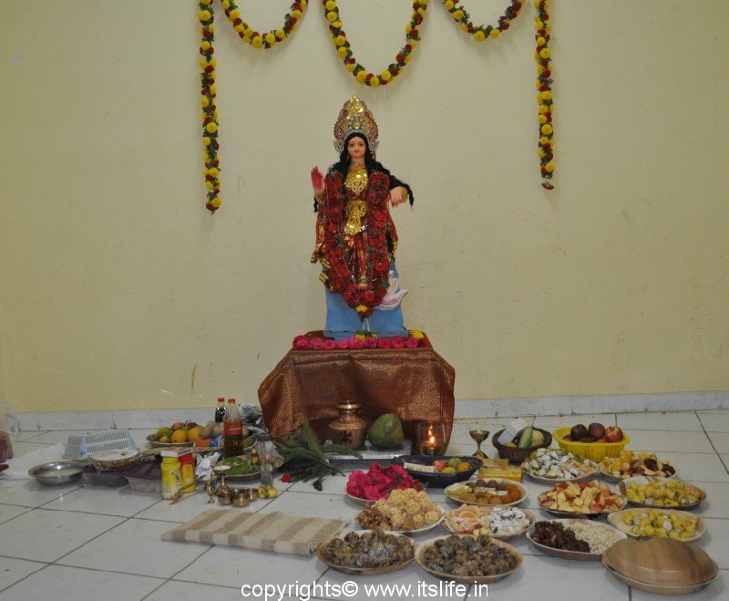 A Kalasha is installed in front of the idol. Offerings like Mustard Oil, Soil from the banks of Ganga, Turmeric, Kumkum, Perfume, Food grains, Grass, Flowers, five kinds of Fruits, Curd, Ghee, Conch shell bangles, Kohl, Yellow thread, Iron bangle, White Mustard Seeds, Rice, Gold, and Honey are placed in plates around the idol of the goddess.
