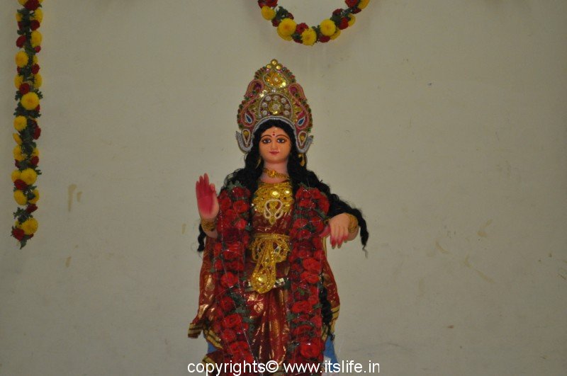 The doorways are decorated with a Rangoli known as Alpana. Alpana is prepared using Rice Flour.