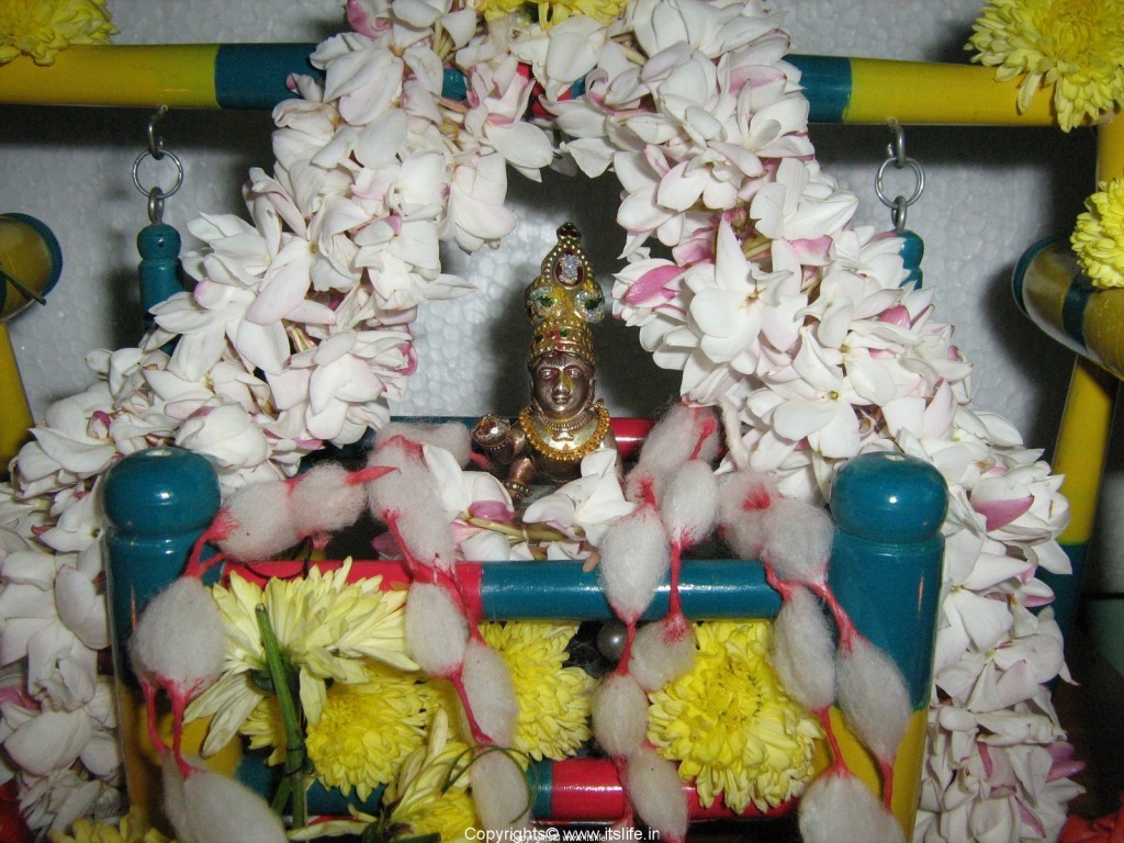 In households a small cradle made up of wood or silver is decorated and the idol of Balakrishna (baby Krishna) is placed in it and worshiped. A special Aarathi is performed and songs in praise of Lord Krishna is sung. The neighborhood women and children are invited home and are offered auspicious items like Kumkum, Turmeric powder, flowers, fruits, betel leaf and nuts and a packet of assorted savories. The women sing lullabies and the cradle is slowly swayed by a thread decorated with flowers. Baby boys are dressed as Krishna complete with peacock feather in the hair and a flute in the hand. Grandparents narrate stories of Krishna’s childhood pranks to their grand children.