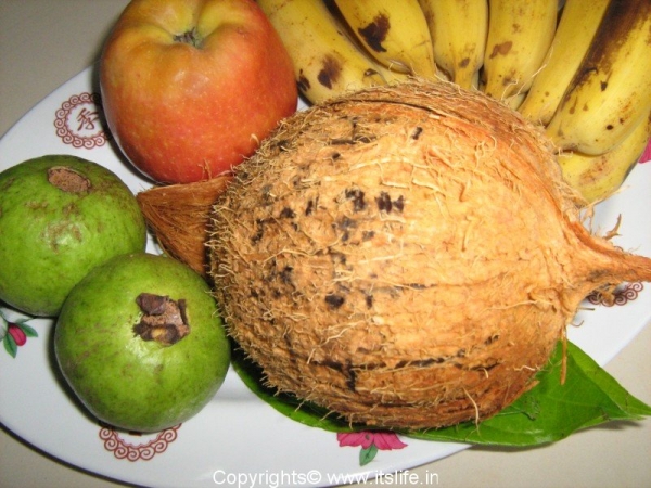 Picture5 – Fruits and Coconut arranged on the betel leaf with adike - Flowers