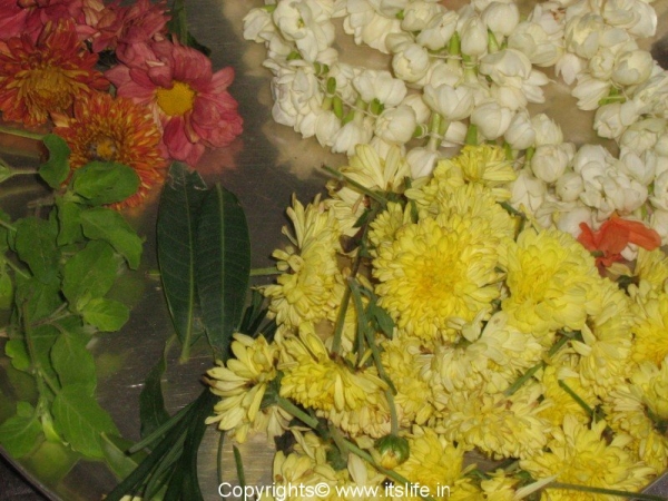 Picture6 – Flowers and leaves for pooja - Sandal Paste (This is prepared by rubbing a Sandal wood piece over a Sanekallu (a hard base) with water continuously for 5 minutes)