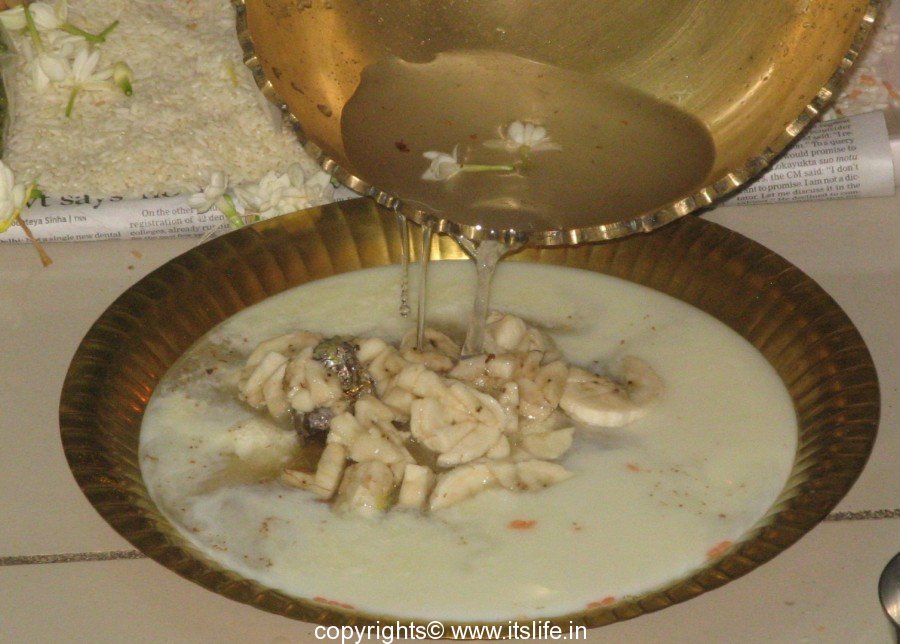 When ripe fruits of Banana and Mangoes are used in the ritual, it is known as “Phala Panchamrutha”, here “Phala” means fruit. After every ingredient “Shudhodaka snana” i.e, pure water is poured on the idols. Sometimes, “Phala Neera” i.e., tender coconut water is also used to bathe the idols.