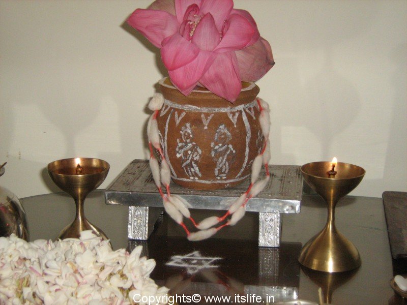 This is known as Sampath Gowri Gadige. Put Rice, Dry Date, Turmeric Root, and Betel Nut inside the pot and place it in the shrine.