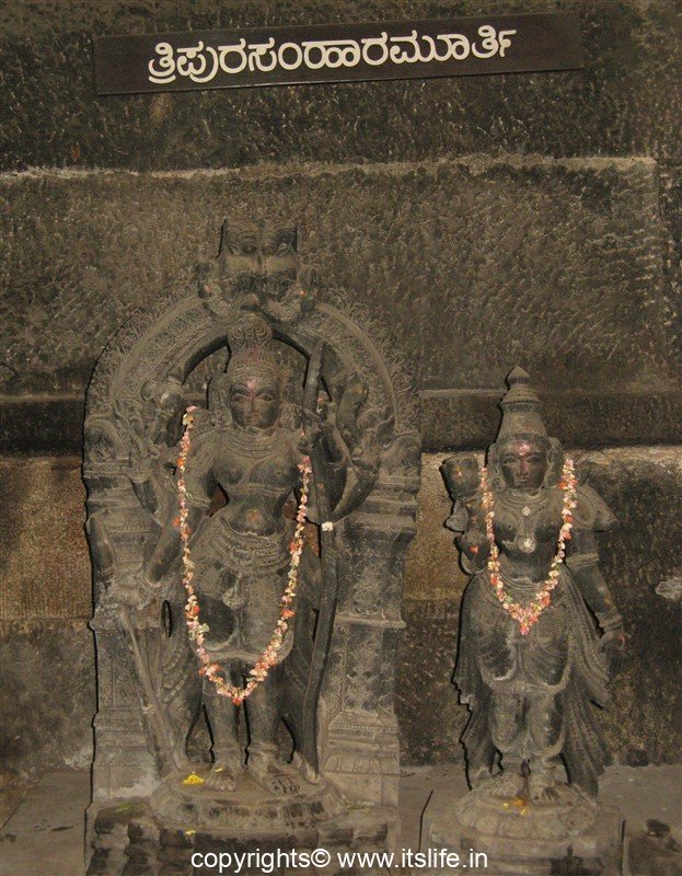 Lord Vishnu in the form of a cow along with Brahma in the form of a calf, dive into the wells of the three cities and drink up the Amrutha (nectar) that the three demons had filled them with. In order to make the Asuras sin, Lord Vishnu creates a man whose head is shaven, his clothes are faded and he carries a wooden water-pot in his hands. This avatar of Vishnu is known as Bhauddavataara (note: not Gautama Buddha). Bhaudda preached Shoonyaveda to the asuras and did it in such a way that the Asuras started following this veda and shunned the puranic vedas. As the respective wives of the asuras were pathi vrata (a woman who is sincere towards her husband), Bhaudda walked naked in front of the wives and when they looked at him, their pathi vrata got destroyed. Now, the asuras had sinned and could be killed when the three cities align.