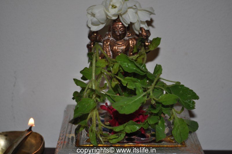 Some people fast the previous day, which is Karthika Shudha Triyodashi day and in the evening bathe and worship Vishnu with 1000 Tulasi leaves chanting the Sahasranama. The next day, which is Vaikunta Chathurdashi day, before sunrise, bathe and worship Shiva with 1000 Bilva leaves chanting the Sahasranama.