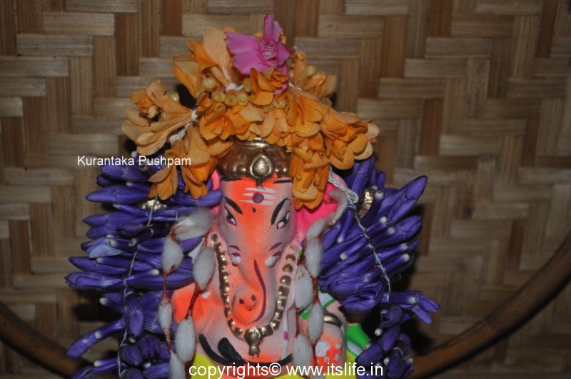 During 21 pushpa pooja Golden Yellow Baleria flower is offered to Lord Ganesha, while chanting the below mantra: “Om Gowri Thanujaaya Namaha, Kurantaka Pushapam Samarpayami”.
