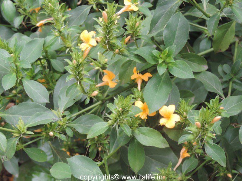 The plant is a prickly shrub and grows to a height of 1.5 meters. The leaves are green ovate, tapering, with visible veins. Every leaf has 3 to 5 sharp spines about 10-20 mm long. Popular species of Barleria are Barleria prionitis and Barleria cristata.