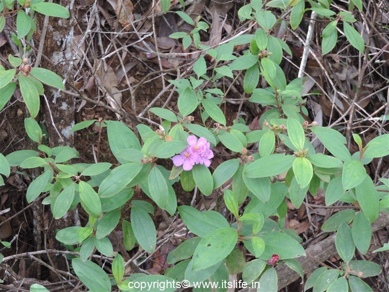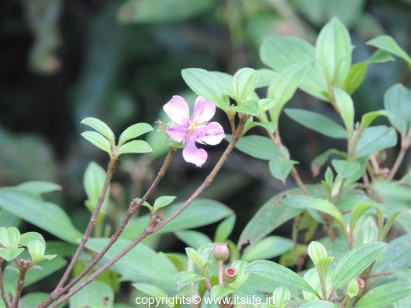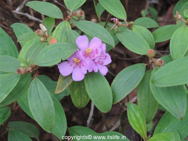 Malabar Melastome is an evergreen shrub and grows up to 2 meters tall. It is a widespread weed in the Western Ghats and is seen in most part of Southeast Asia. Leaves are elliptic to lanceolate and are 2 to 6 cm in length. The leaves are sometimes narrow to oblong and are 4 to 6 cm wide.