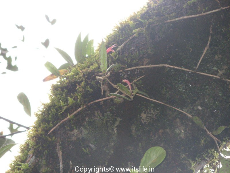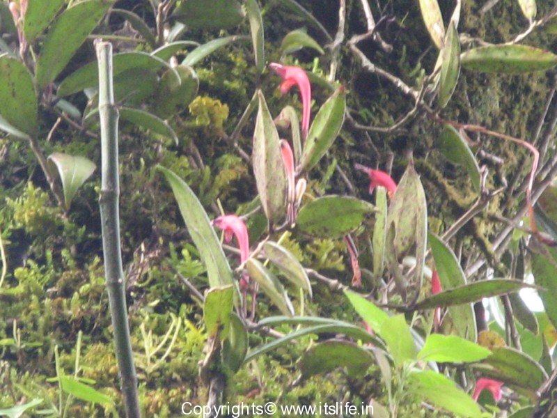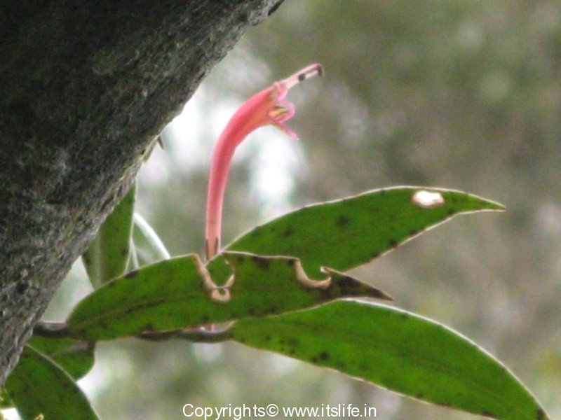 As you traverse into the rain forests of Western Ghats, you will notice orchids, lichens, ferns, and moss attached to tree trunks and branches. In the midst of these green epiphytes I noticed red flowers in bloom on tree branches. Took pictures of these and identified them as Aeschynanathus Perrottetti also known as Lipstick plant.