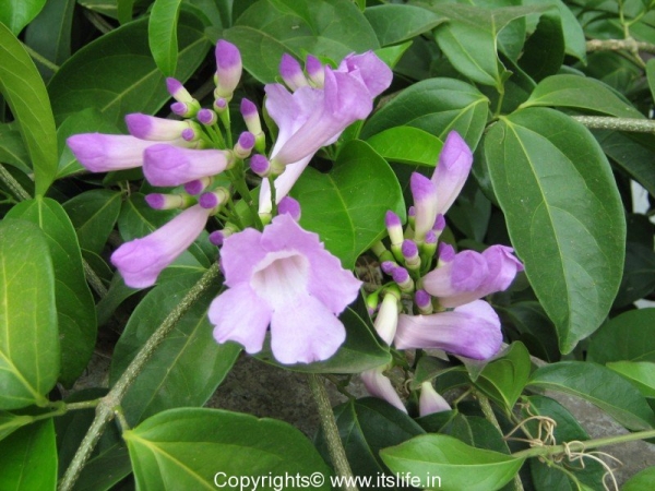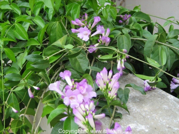 Garlic Creeper can grow up to 12 to 14 feet and is propagated from cuttings. It climbs with the help of its long tendrils. It is usually used to decorate the fence, trellis etc., The plant needs to be trimmed after each flowering season. There is no flowering season for this plant as the buds appear after few days of trimming.
