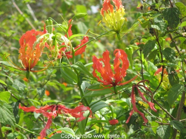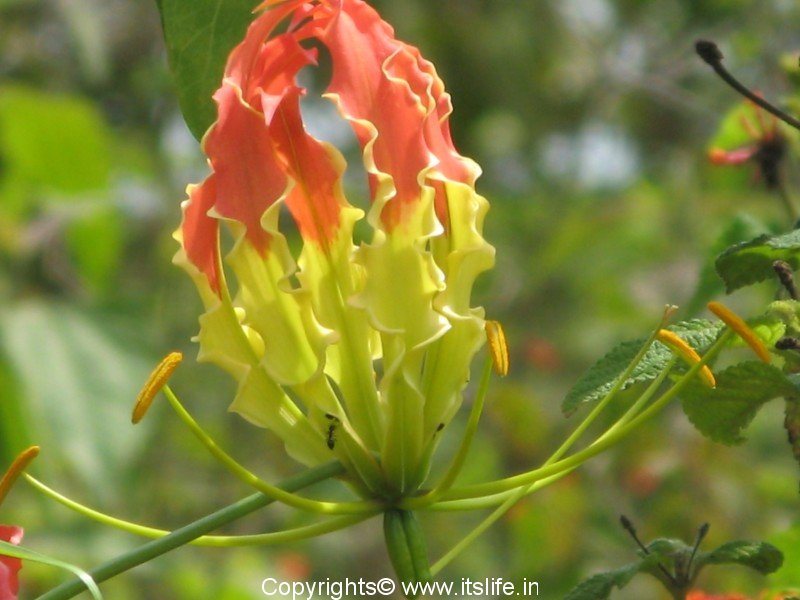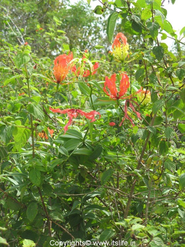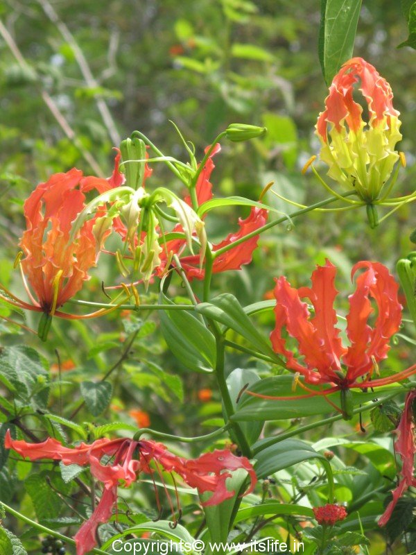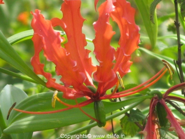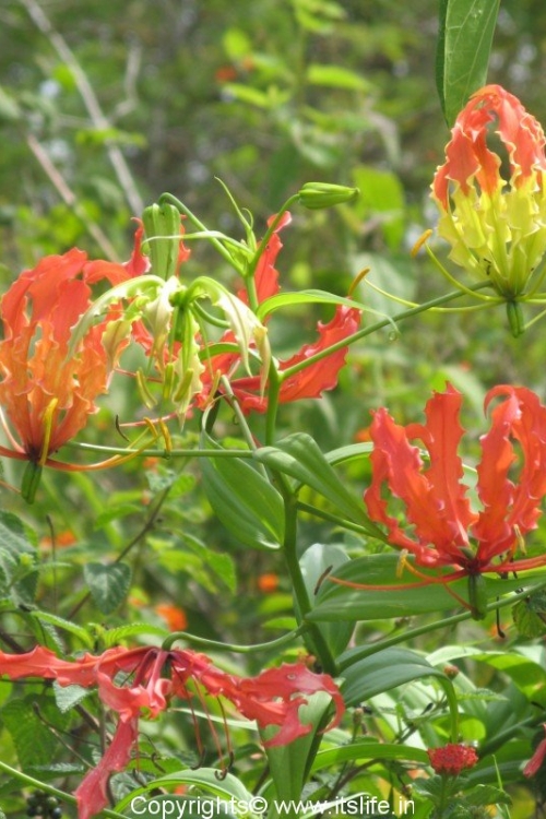 The other common names of this exotic flower are Tiger Claw, Bachnag (Hindi), Agnisikhe (Kannada), Agnimukhi (Sanskrit). Because of the curious shape and colors of the petals of the glory lily the names in different languages link it to snake, tiger claw, fire flames etc. The botanical name is Gloriosa Superba and belongs to the Liliaceae* family.