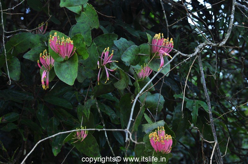 As we hiked in the Malnad region, I came across a creeper with flowers that I had not seen before and took pictures to identify. Found out that it is the Honey Suckle Mistletoe plant. Other common name is Neem mistletoe and in Kannada it is known as Maduk, Badanike, Bandanike, Marabhaksha, in Hindi it is known as Banda, Banda Patha and in Sanskrit it is known as Vrksadani.