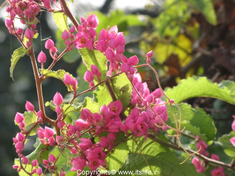 The botanical name is Antigonon Leptopus and belongs to the family Polygonaceae. The creeper has tendril-like twisted ends that help the plant to climb. The flowers are a spray of white and pink flowers and each flower is like a deep cup when it is fully open.
