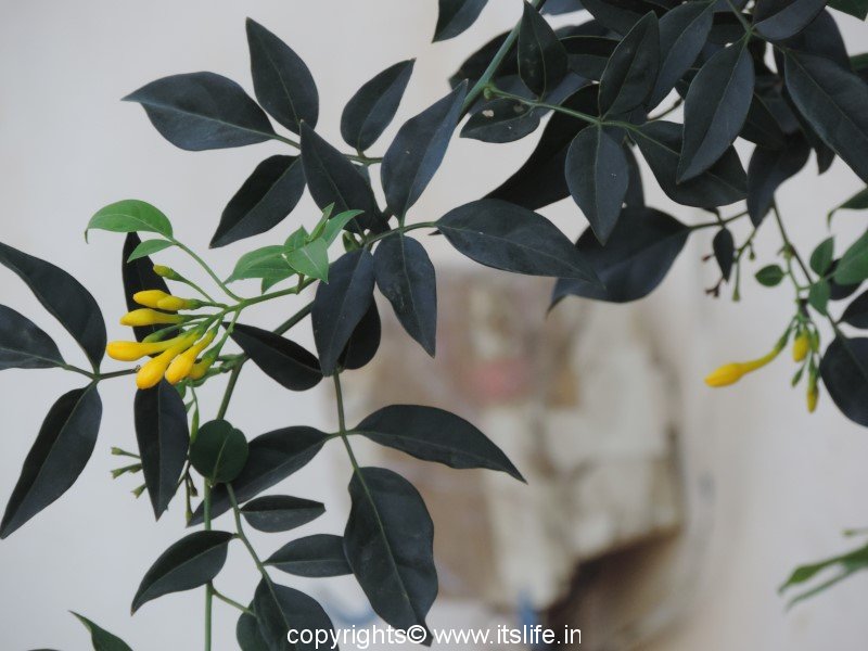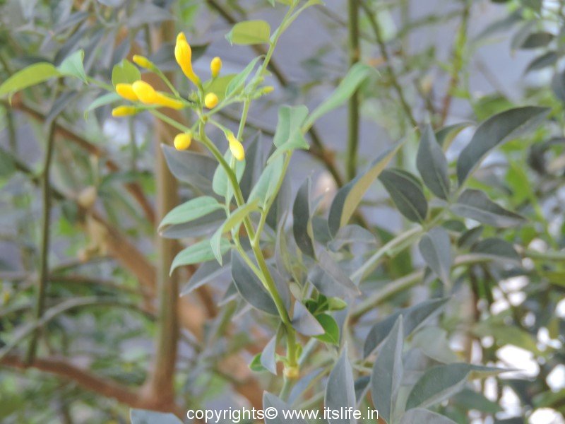 The branches are dark green. The leaves are green pinnate with 3-7 ovate and thick leaflets. Flowers are Yellow and has a slender tube. They are 1 to 2 cm long with 5 petals.