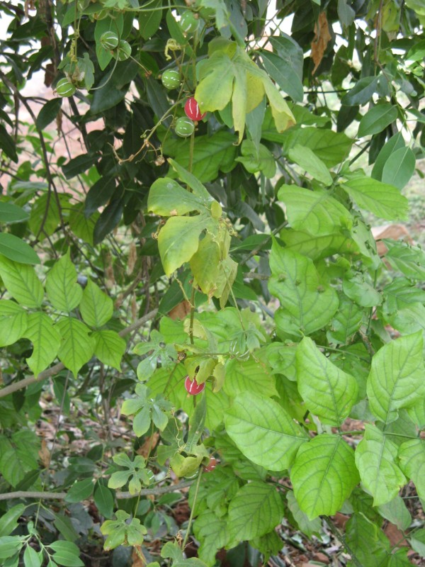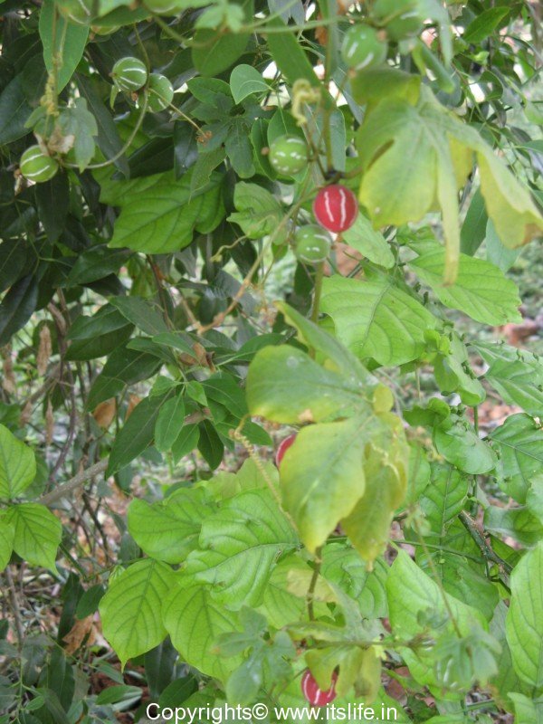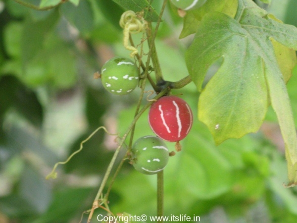 Flowers are white to greenish-yellowish and small. The main attraction of this creeper are the fruits. They are oval, around 1.5 to 2.5 cms. Turns Red when rip with longitudinal white stripes. Looks like the candies or lollipops.