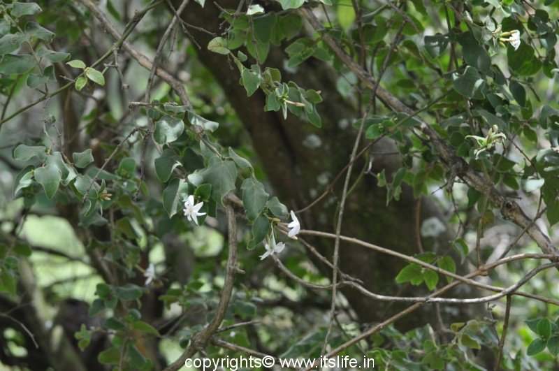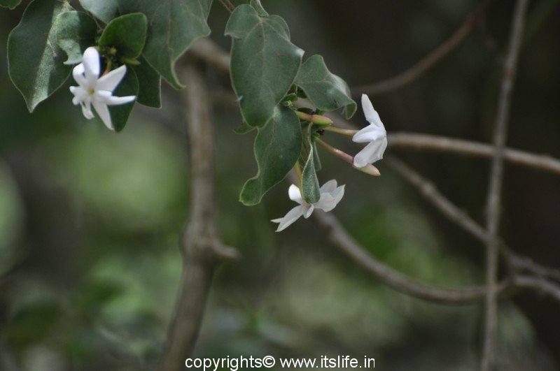 Wild Jasmine is another common name of this flower with a lovely fragrance. In Marathi Malabar Jasmine is known as Kusar or Ran Mogra, in Tamil it is known as Kotivakai, in Kannada it is known as Kadu Mallige and in Sanskrit it is known as Mudgara. Botanical name is Jasminum malabaricum and belongs to Oleaceae family (Jasmine). Pictures the below creeper in the middle of the forests in Kodaikanal.