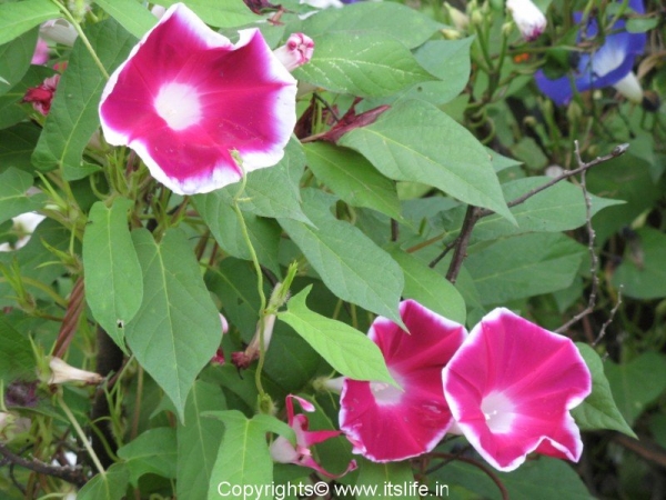 They are fast growing plants and bloom profusely in good conditions. The leaves are green and heart shaped. Flowers are funnel-shaped and bloom in Red, Pink, Blue, Purple, Violet, White, and Red colors. Seeds are black, ovoid-trigonous.