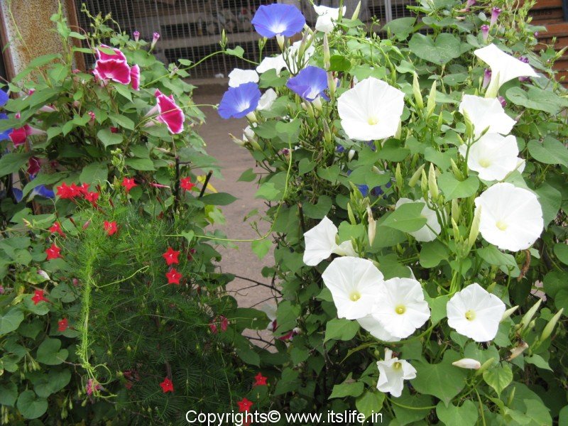 Morning Glory is very easy to grow from seeds. You can grow them in beds, pots, or hanging pots. Provide support when they are about 6 inches tall in beds and pots. They can spill over in a hanging pot.