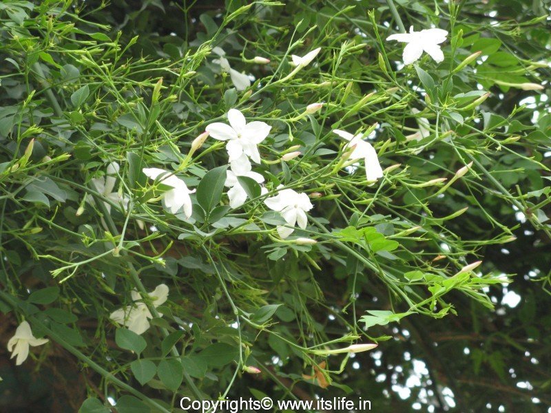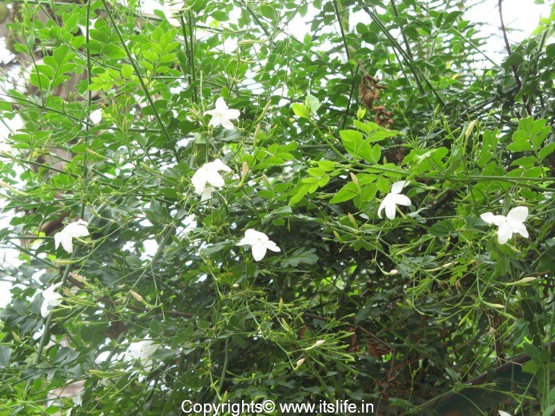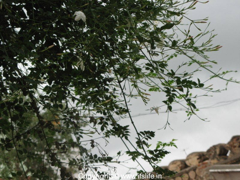 The leaves are compound dark green. The buds are pink and when they open the petals are white, delicate, and look like stars. They bloom in clusters at the tip of the branches. The fragrance is lovely and drives away depression and bad moods. In India blooming season is from end of July to October.